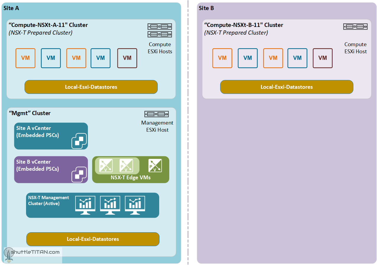 Note: Site B’s “Edge VMs” and “physical router” in the image above are just for illustration and the configuration will be focused in a separate blog “NSX-T Disaster recovery” in the future. For this NSX-T Installation series, we are going to focus on Site-A Edge VMs configuration and some prep work for Site-B.
