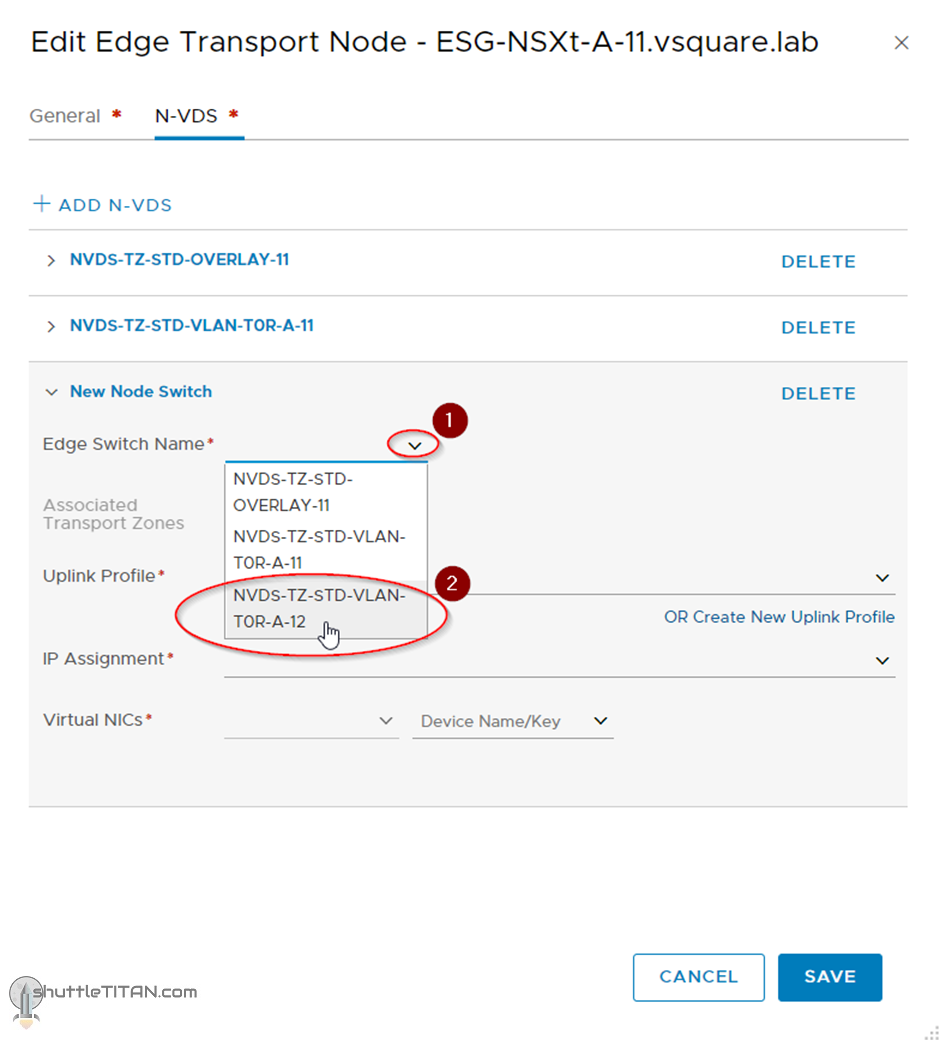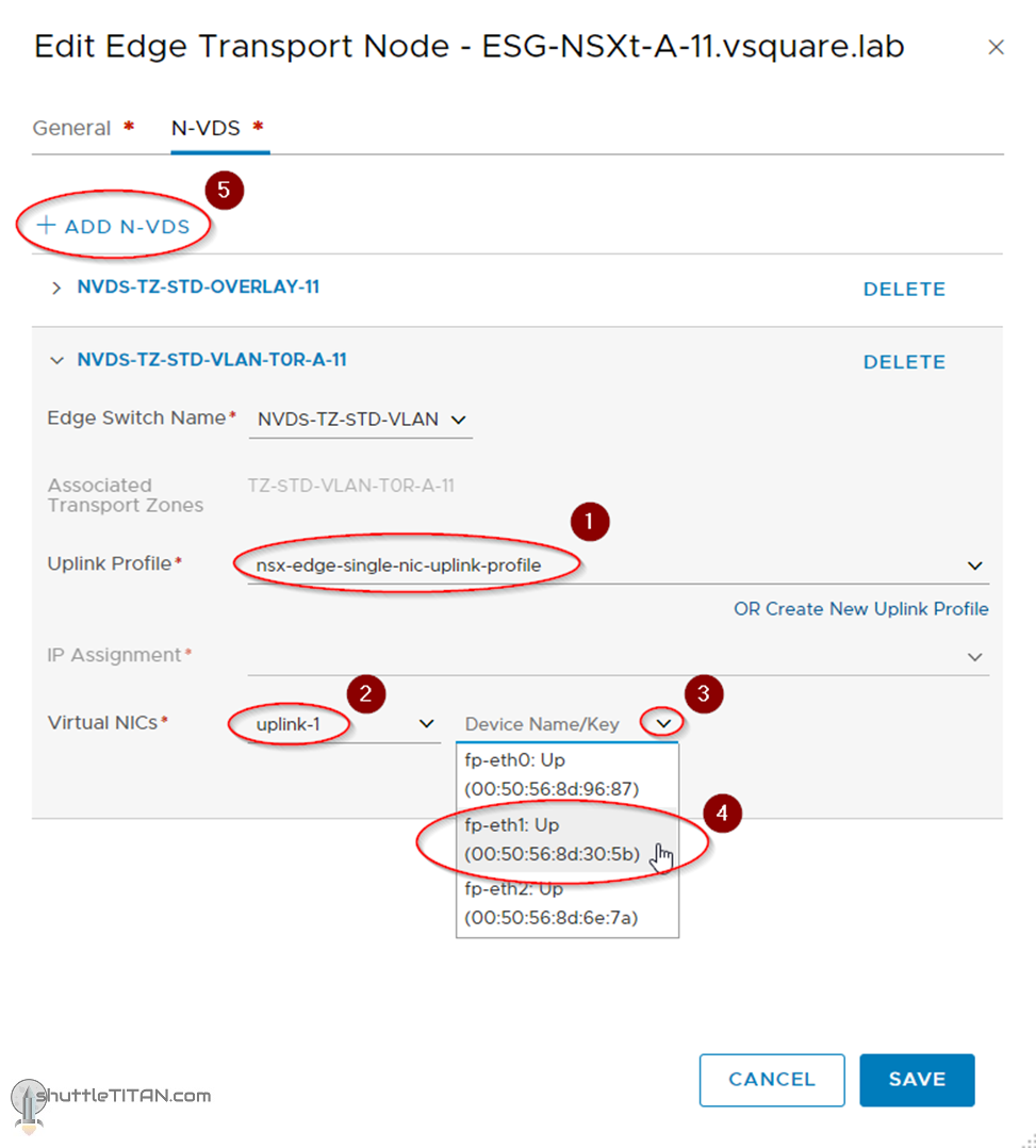 7. Select the uplink profile, Virtual NIC as “Uplink 1” and “fp-eth1”. Click “ADD N-VDS”, as shown in the screenshot below: