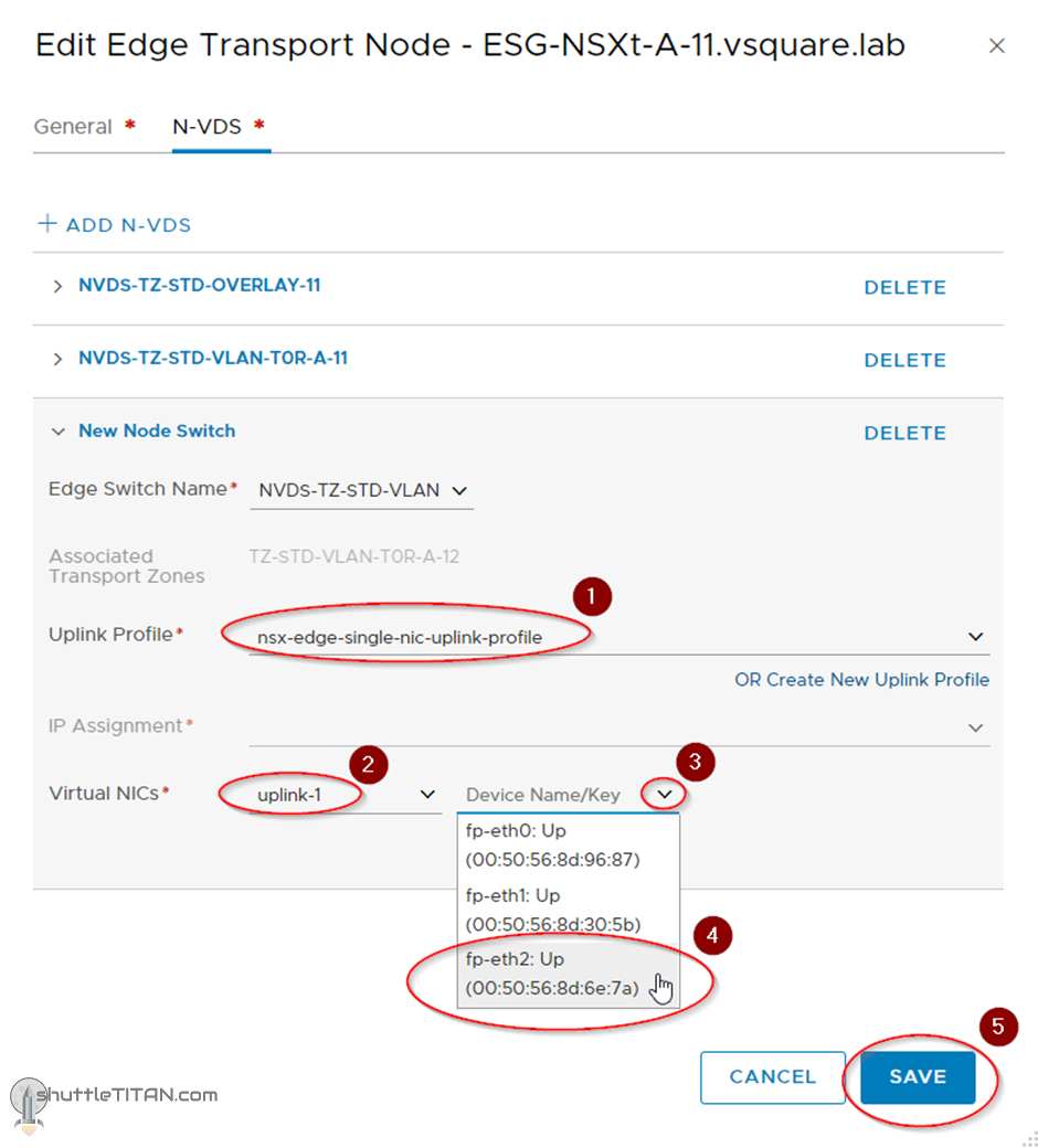 9. Select the uplink profile, Virtual NIC as “Uplink 1” and “fp-eth2”. Click “SAVE”, as shown in the screenshot below: