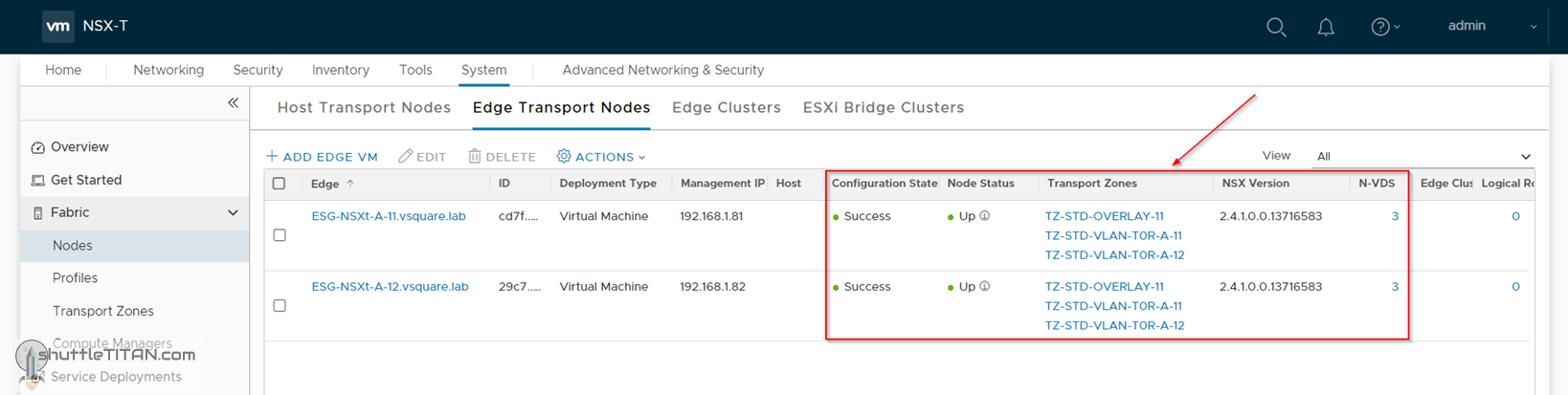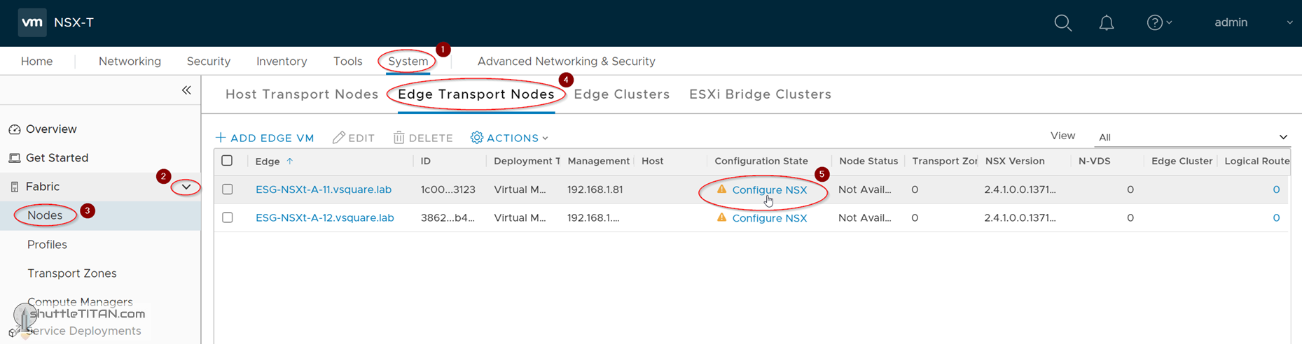 2. Click System -> Fabric -> Nodes -> Edge Transport Nodes -> Click Configure NSX:
