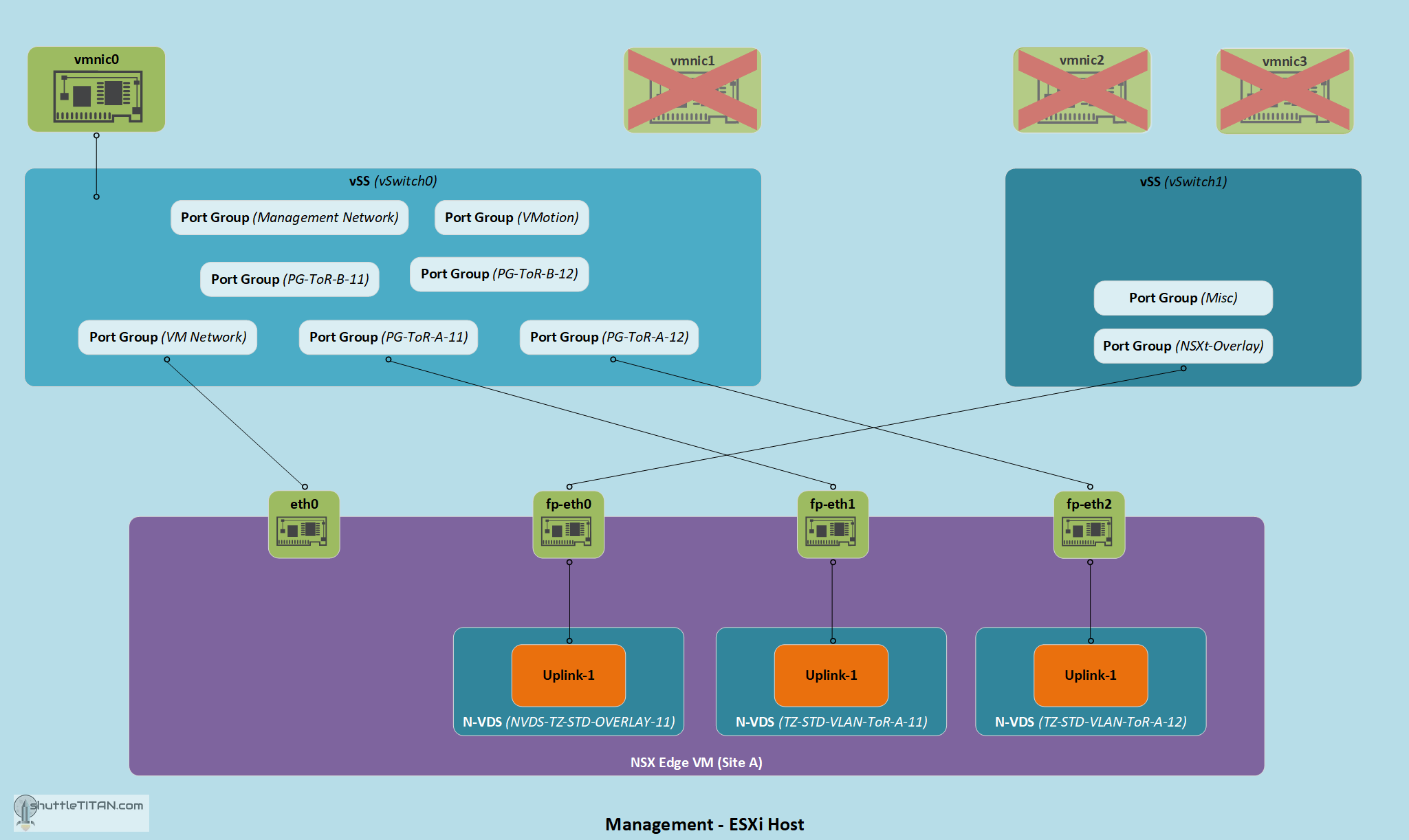 However, if you are deploying this in a Home Lab or performing a PoC, following my blog Home Lab Setup – Nested ESXi Host’s networking for NSX-T, the NSX-T Edge design will look like below, as I am using only ONE pnic on my Management/Edge ESXi Host and all Compute ESXi hosts are nested: