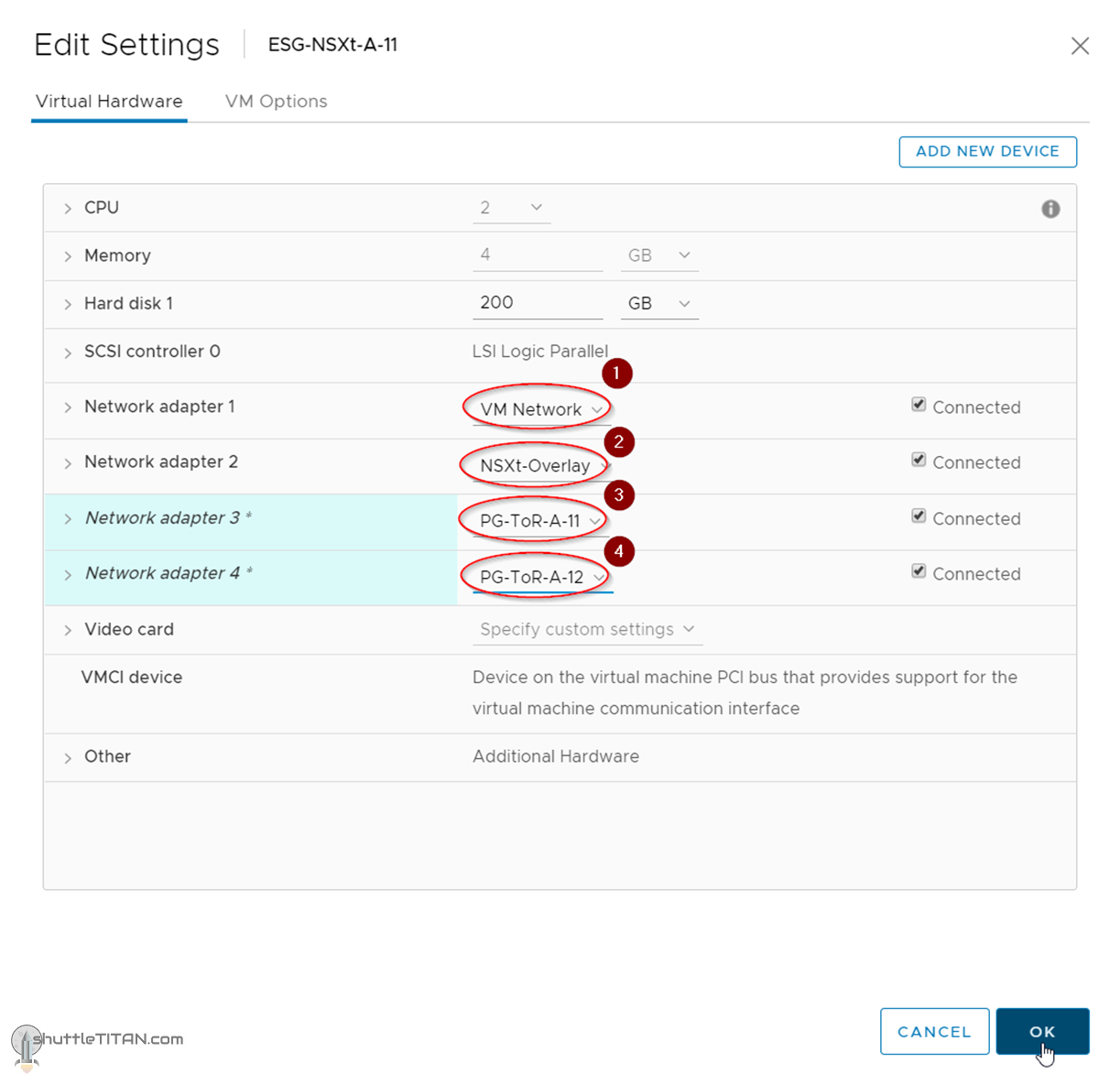 1. Edit the Edge VMs, deployed via vSphere UI in the previous step, configure the 4 vNICs as below: