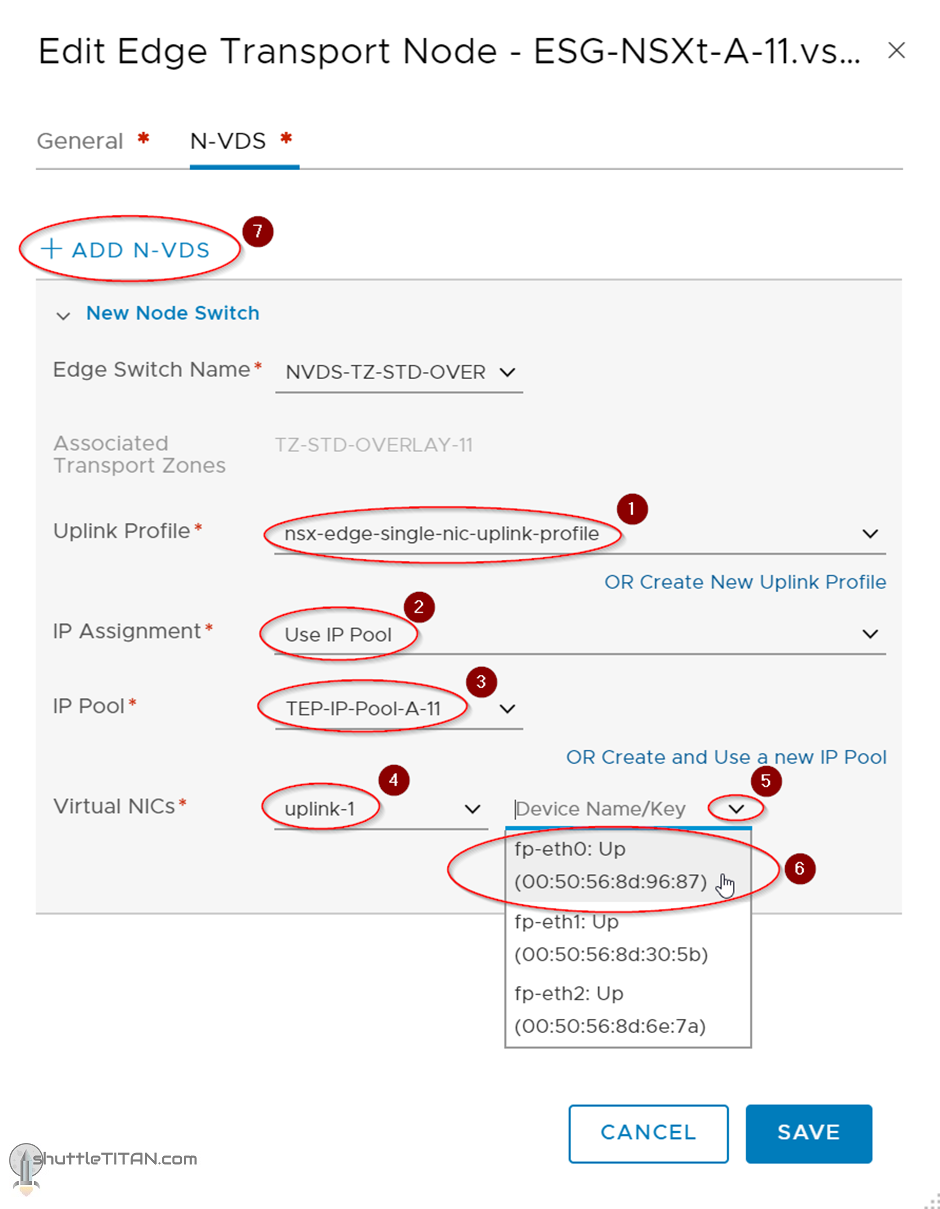 5. Select the uplink profile, IP Pool, Virtual NIC as “Uplink 1” and “fp-eth0”. Click “ADD N-VDS”, as shown in the screenshot below